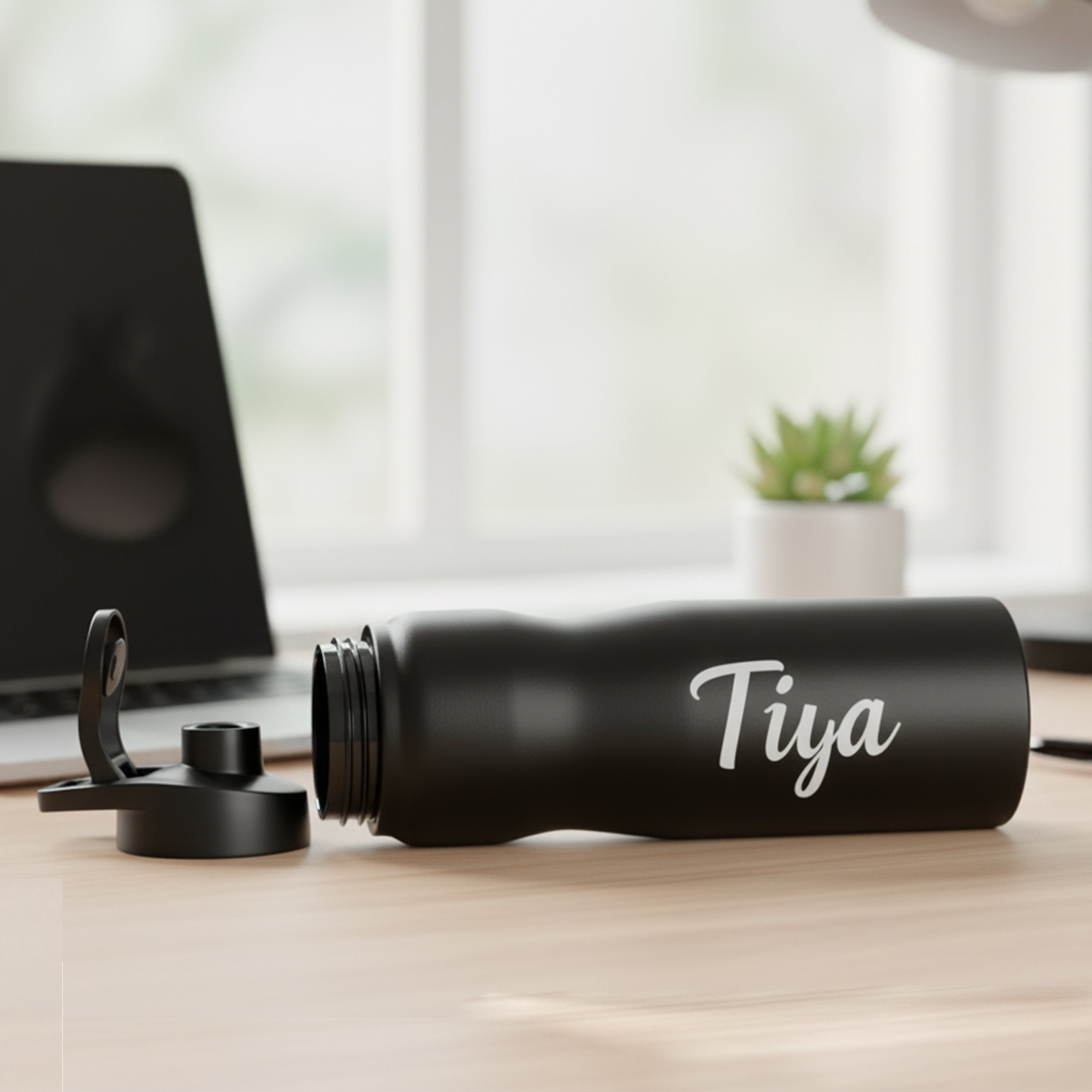 Made from sturdy steel, this 750ml black water bottle blends durability with personalized flair. Featuring a customizable name option, -